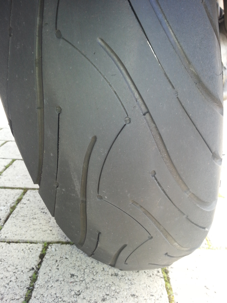 Michelin PR3s on the Honda ST1300A (23/8/14) Not long now and I’ll be grabbing the PR4s.. Front – 120/70ZR18 @ 34,050 km Rear – 170/60ZR17 @ 31,961 km